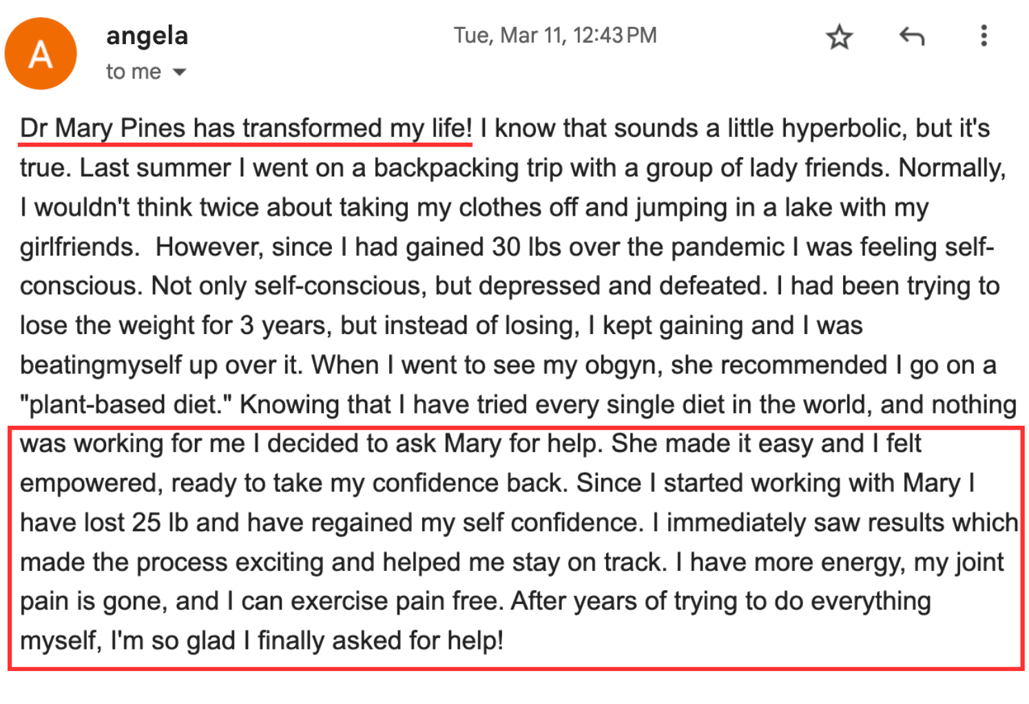 “I've got more energy. I'm less crabby. I'm sleeping better. I'm starting to lose weight. My skin is better. My PMS has gone, my anxiety has gone from an 8 to a 2. I'm finding joy in my life and I've really been able to fine tune my eating habits and just not even like diet or restriction…My inflammation has gone down from 13 to 2, so I'm not sore anymore.