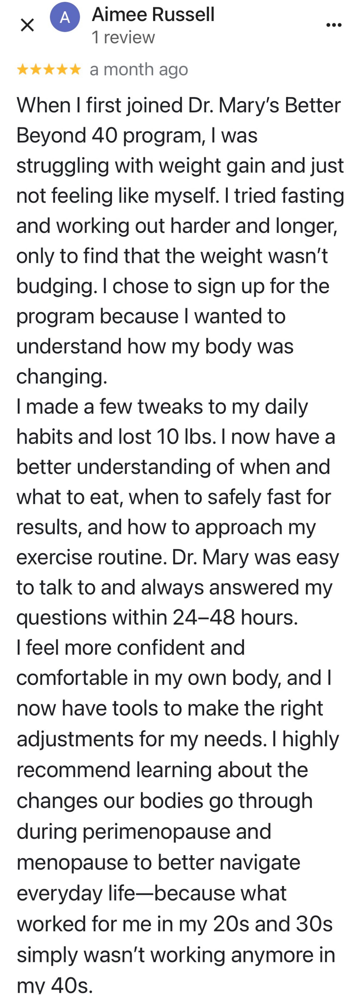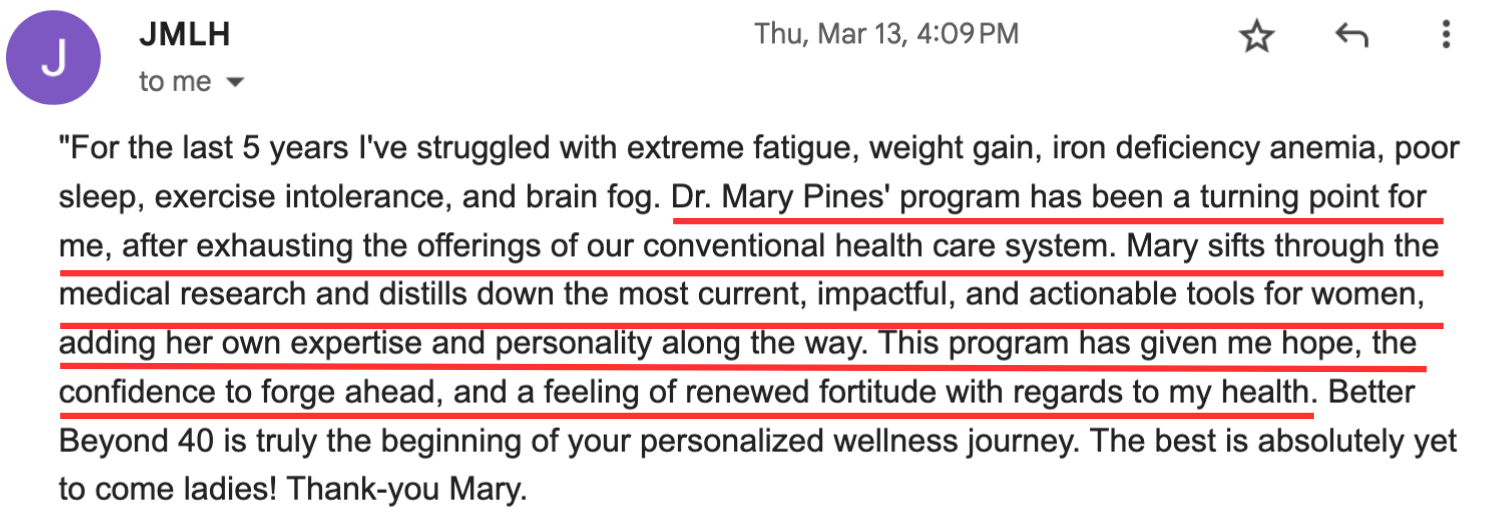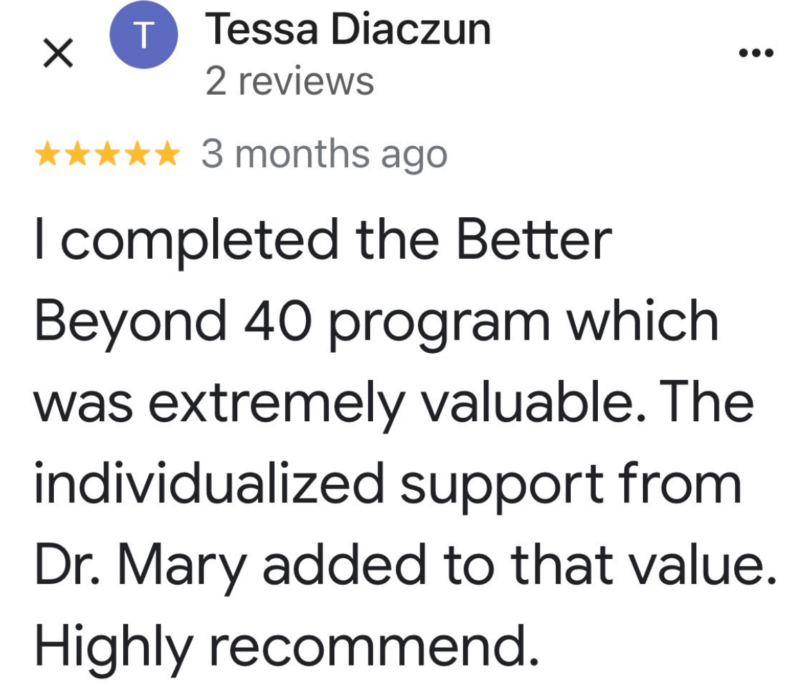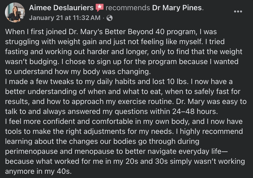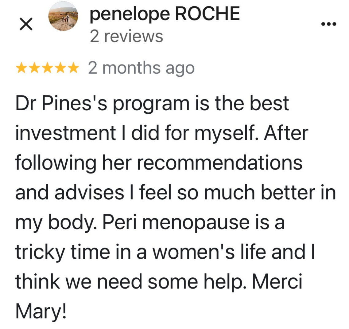 It’s just the whole picture - mindset to diet, to exercise, to hormonal balance, and then also the support, just the camaraderie of other women in the program. As I become more balanced and knowledgeable and progress along through the course with other women, it’s super helpful because we all share a common thing…