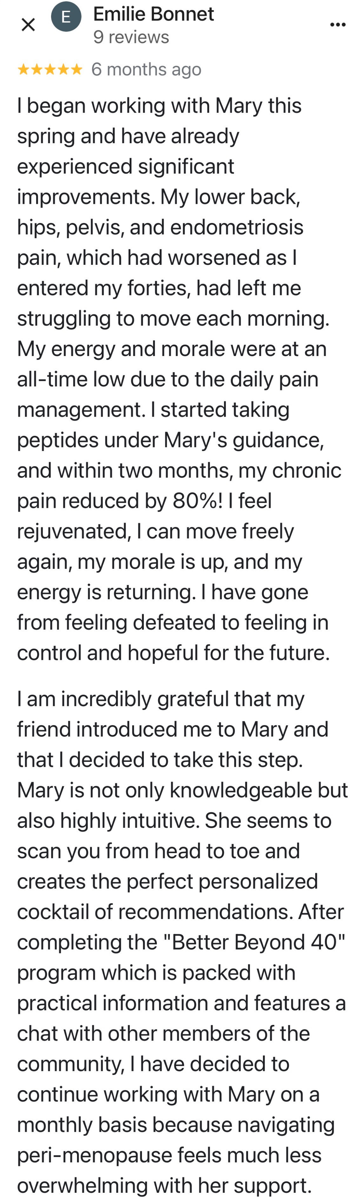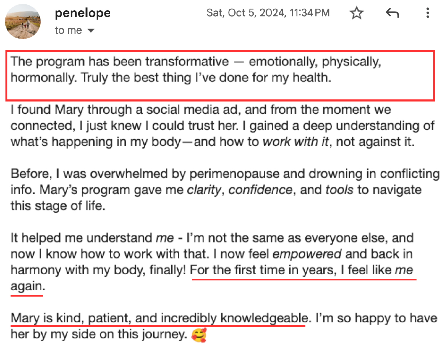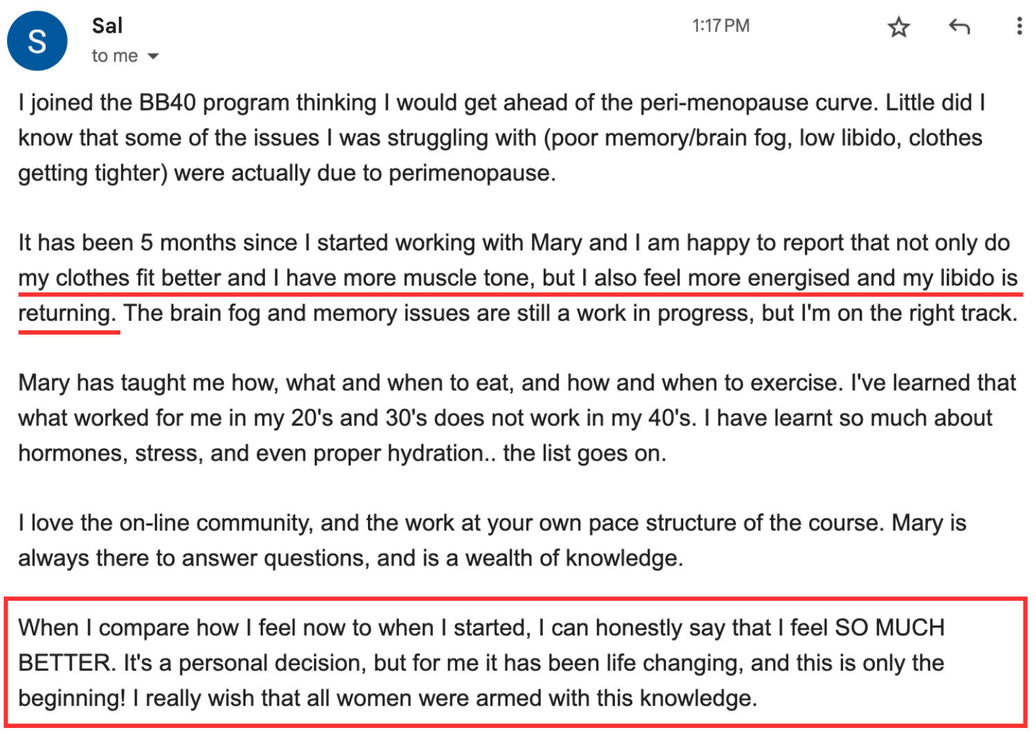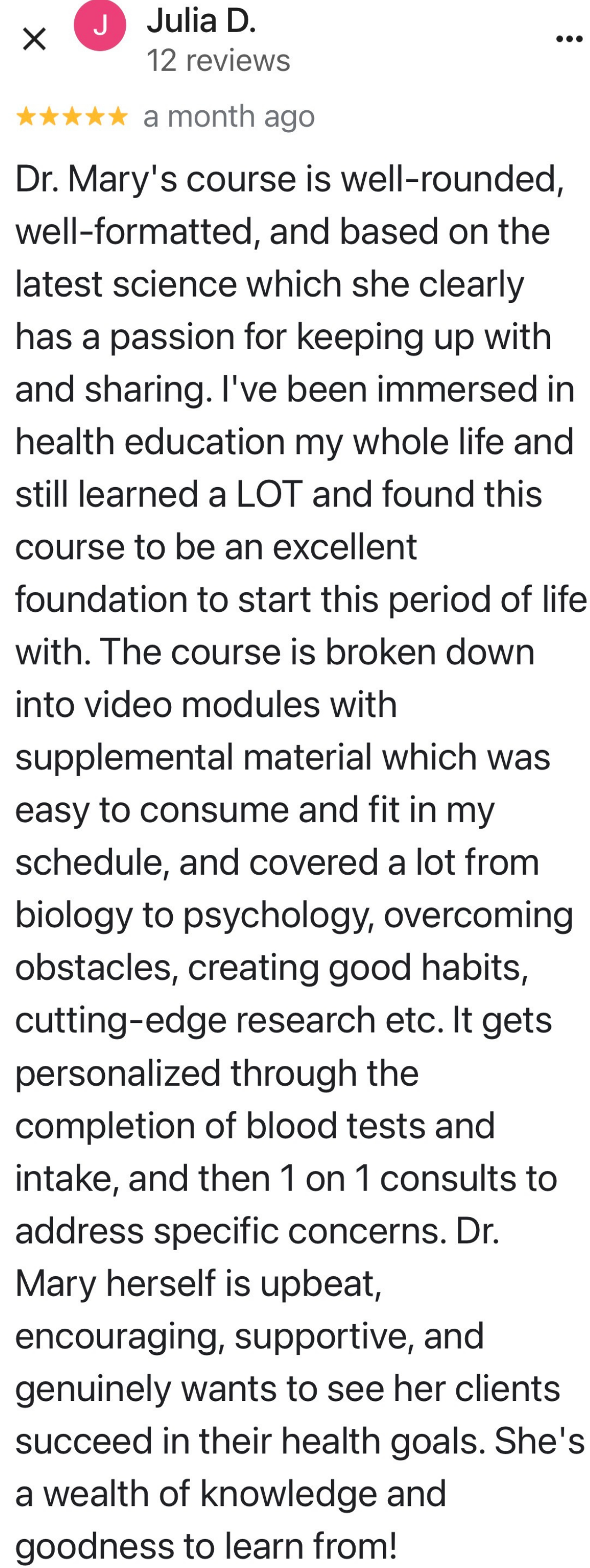 It’s just the whole picture - mindset to diet, to exercise, to hormonal balance, and then also the support, just the camaraderie of other women in the program. As I become more balanced and knowledgeable and progress along through the course with other women, it’s super helpful because we all share a common thing…