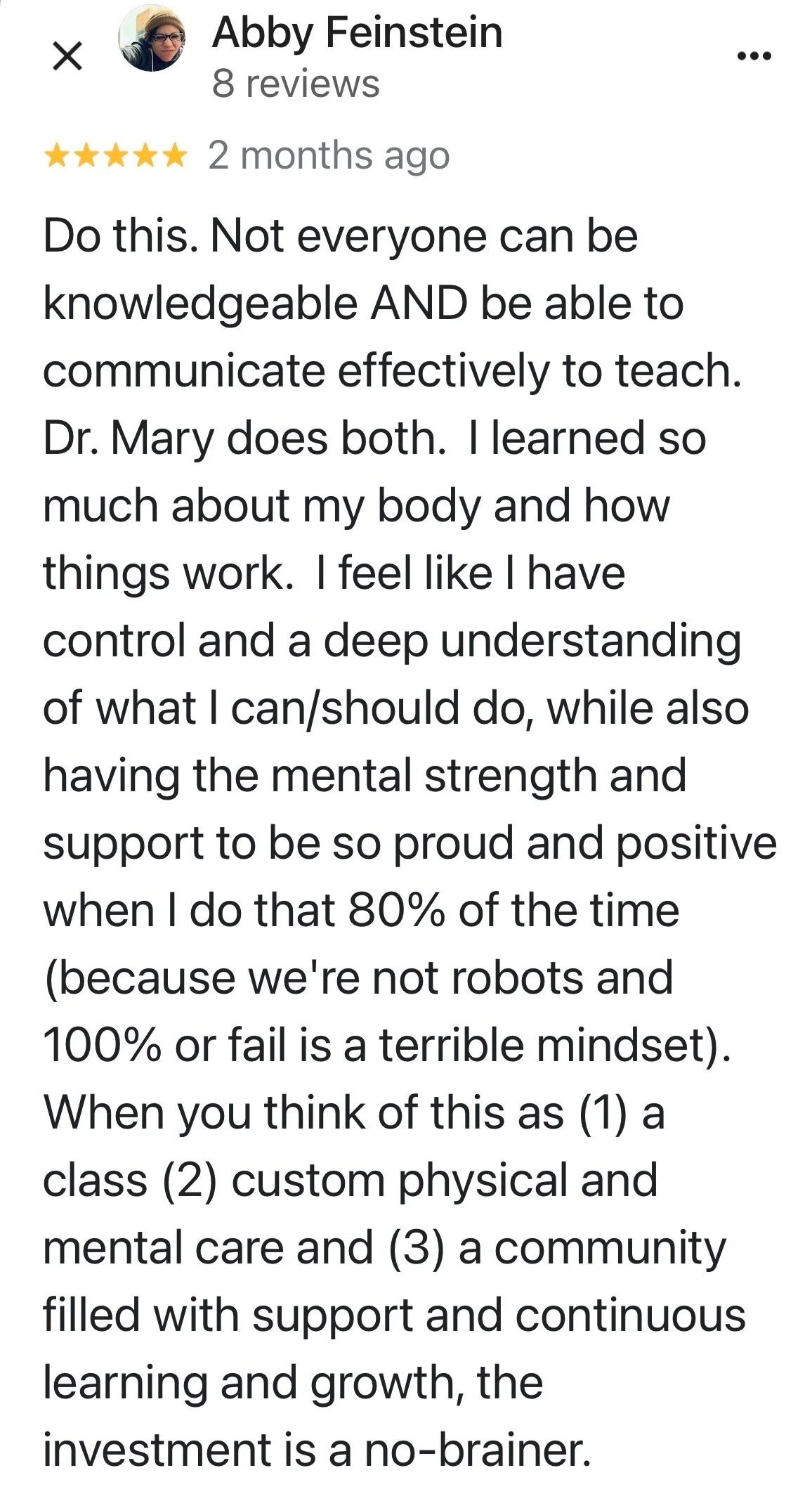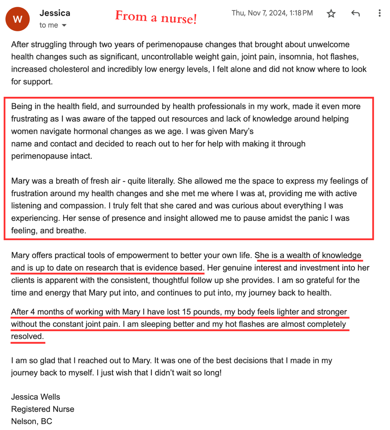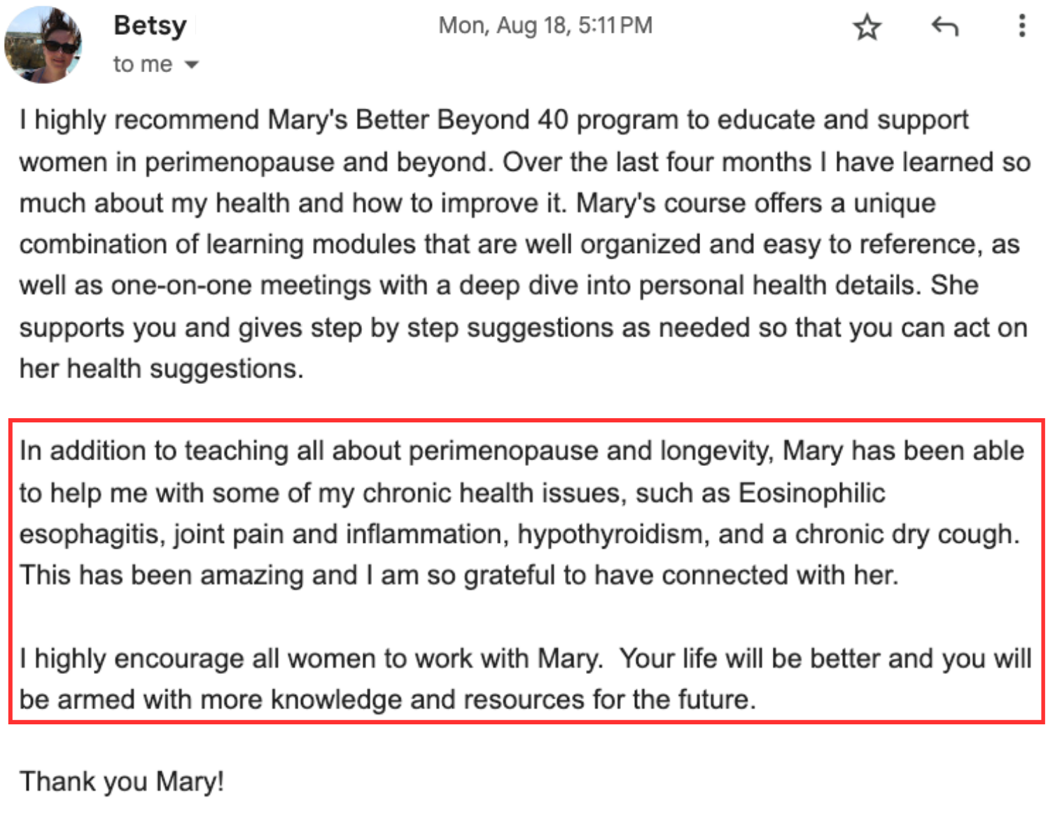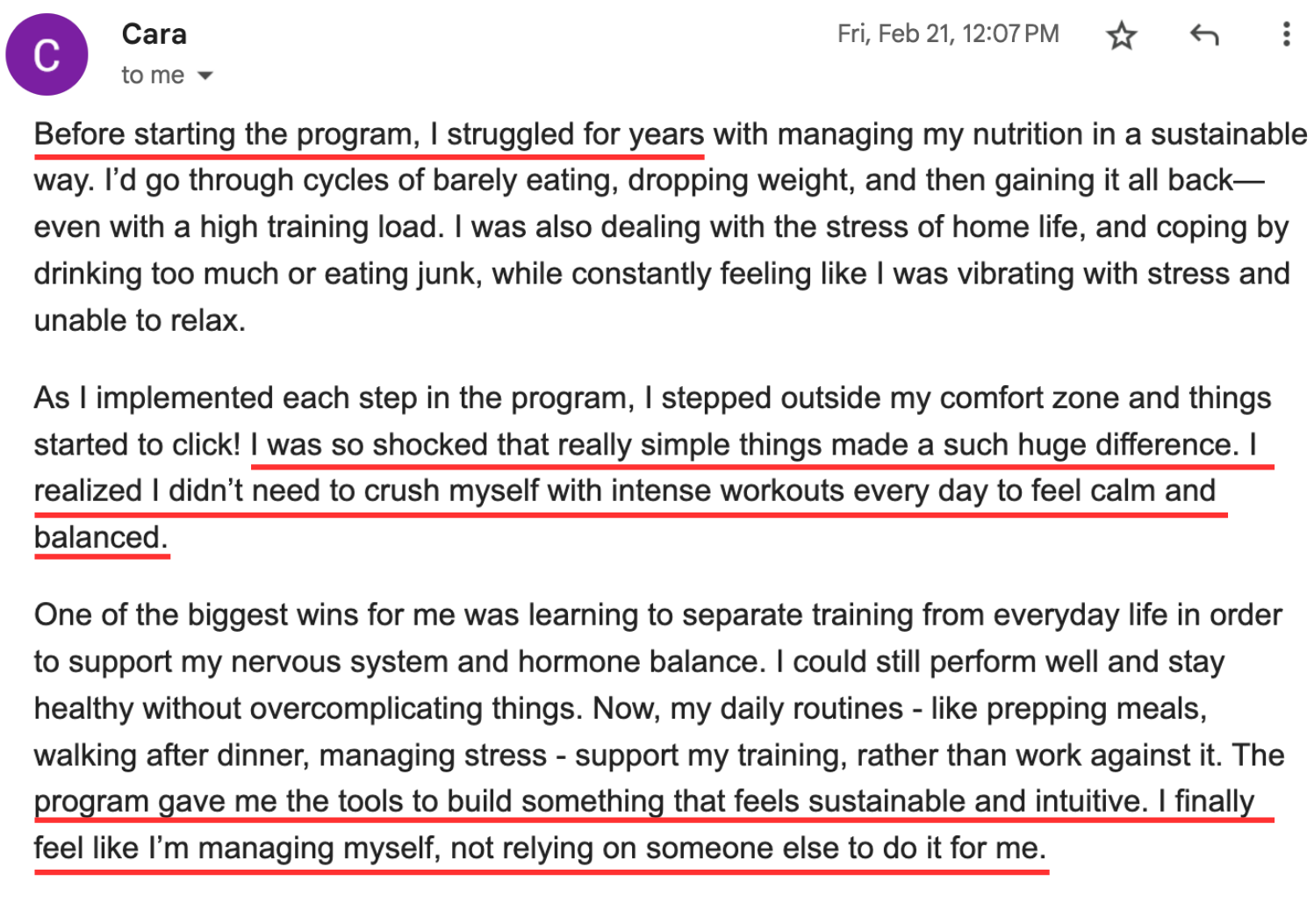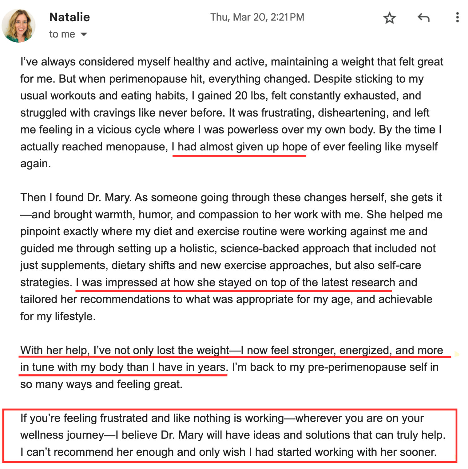 It’s just the whole picture - mindset to diet, to exercise, to hormonal balance, and then also the support, just the camaraderie of other women in the program. As I become more balanced and knowledgeable and progress along through the course with other women, it’s super helpful because we all share a common thing…