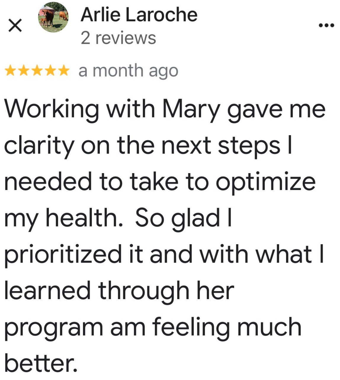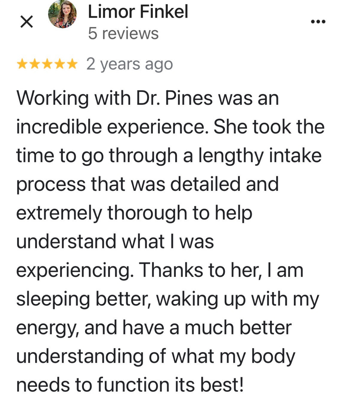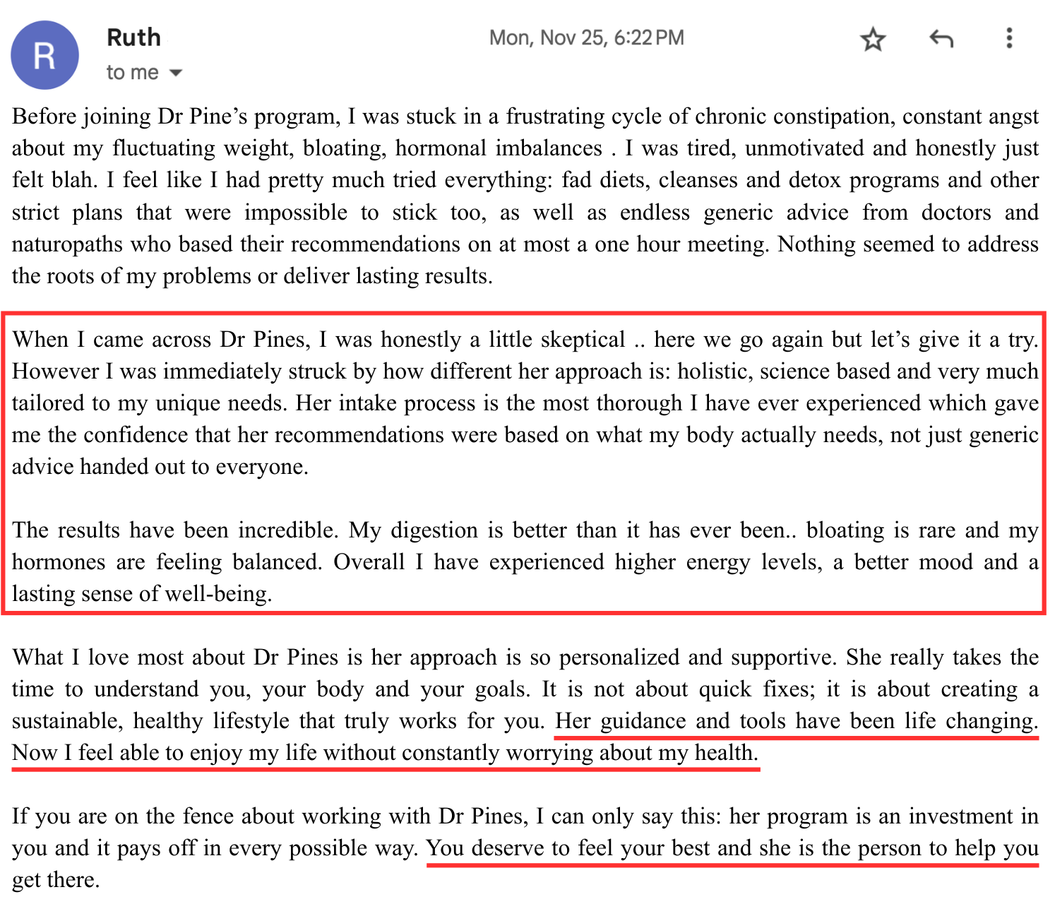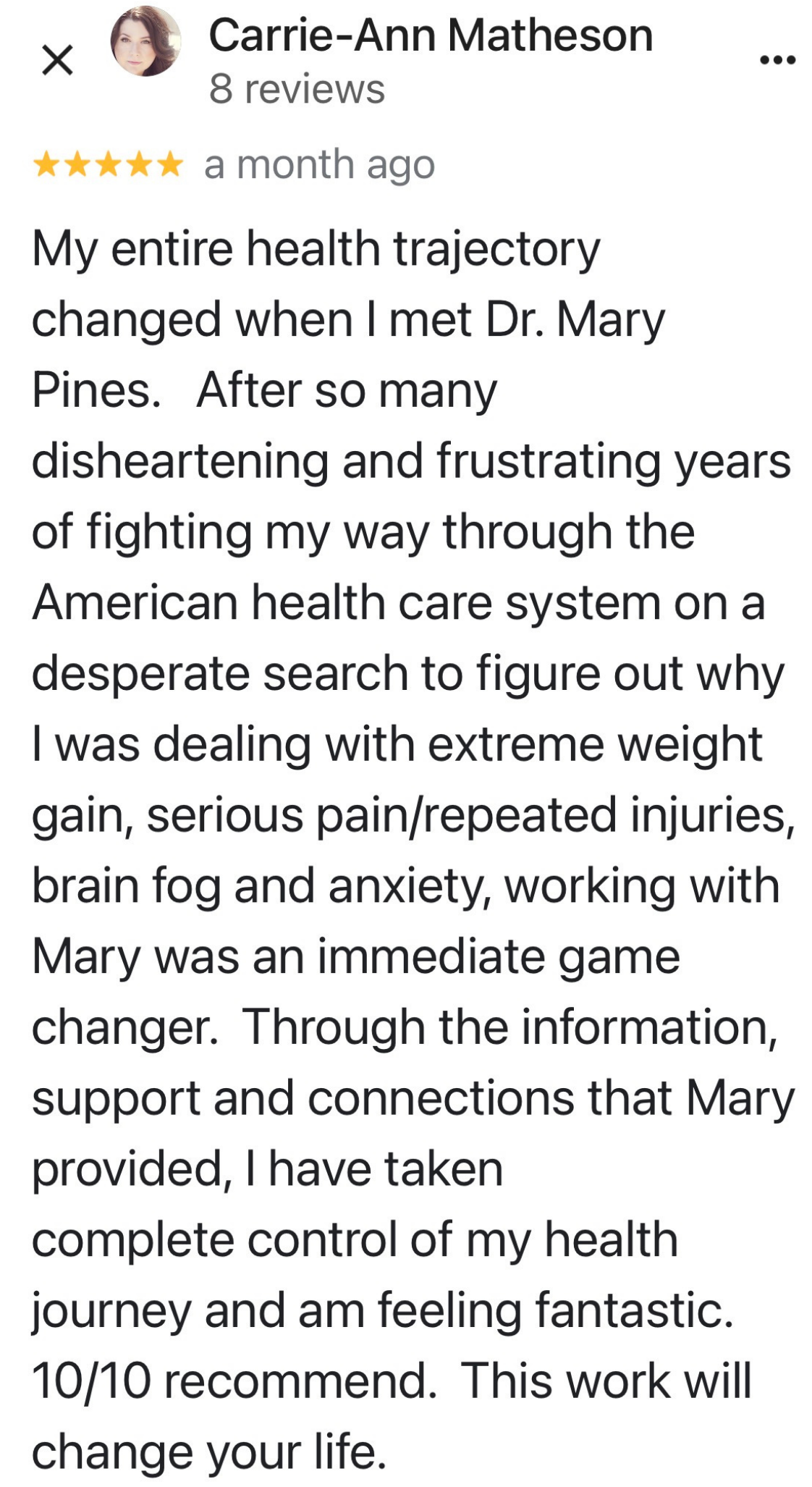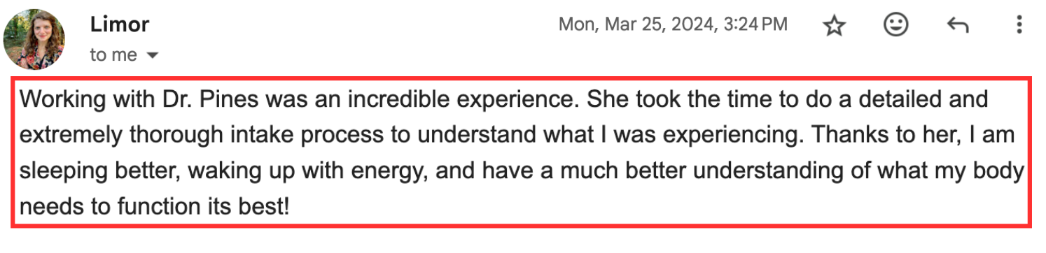 “I've got more energy. I'm less crabby. I'm sleeping better. I'm starting to lose weight. My skin is better. My PMS has gone, my anxiety has gone from an 8 to a 2. I'm finding joy in my life and I've really been able to fine tune my eating habits and just not even like diet or restriction…My inflammation has gone down from 13 to 2, so I'm not sore anymore.